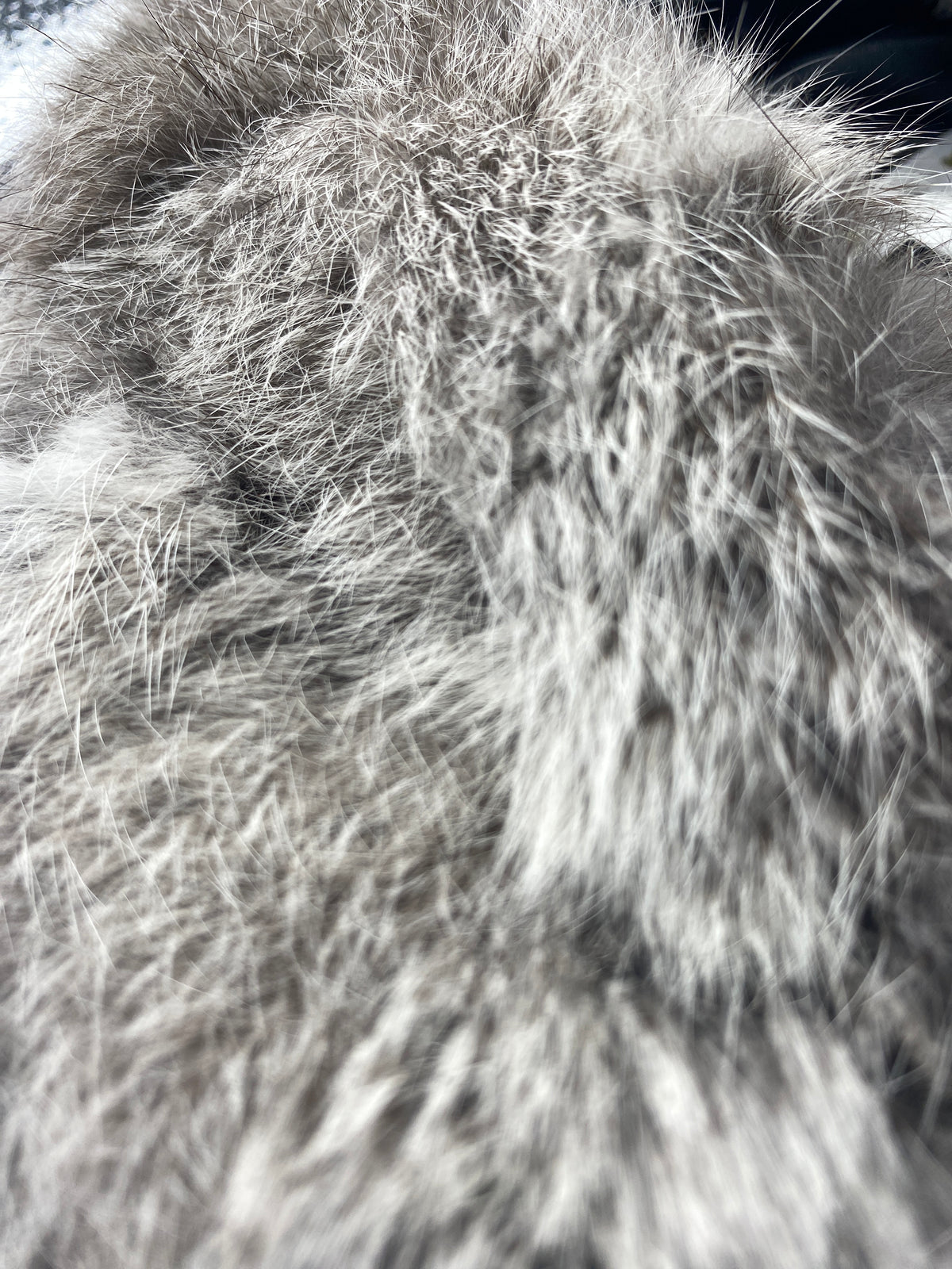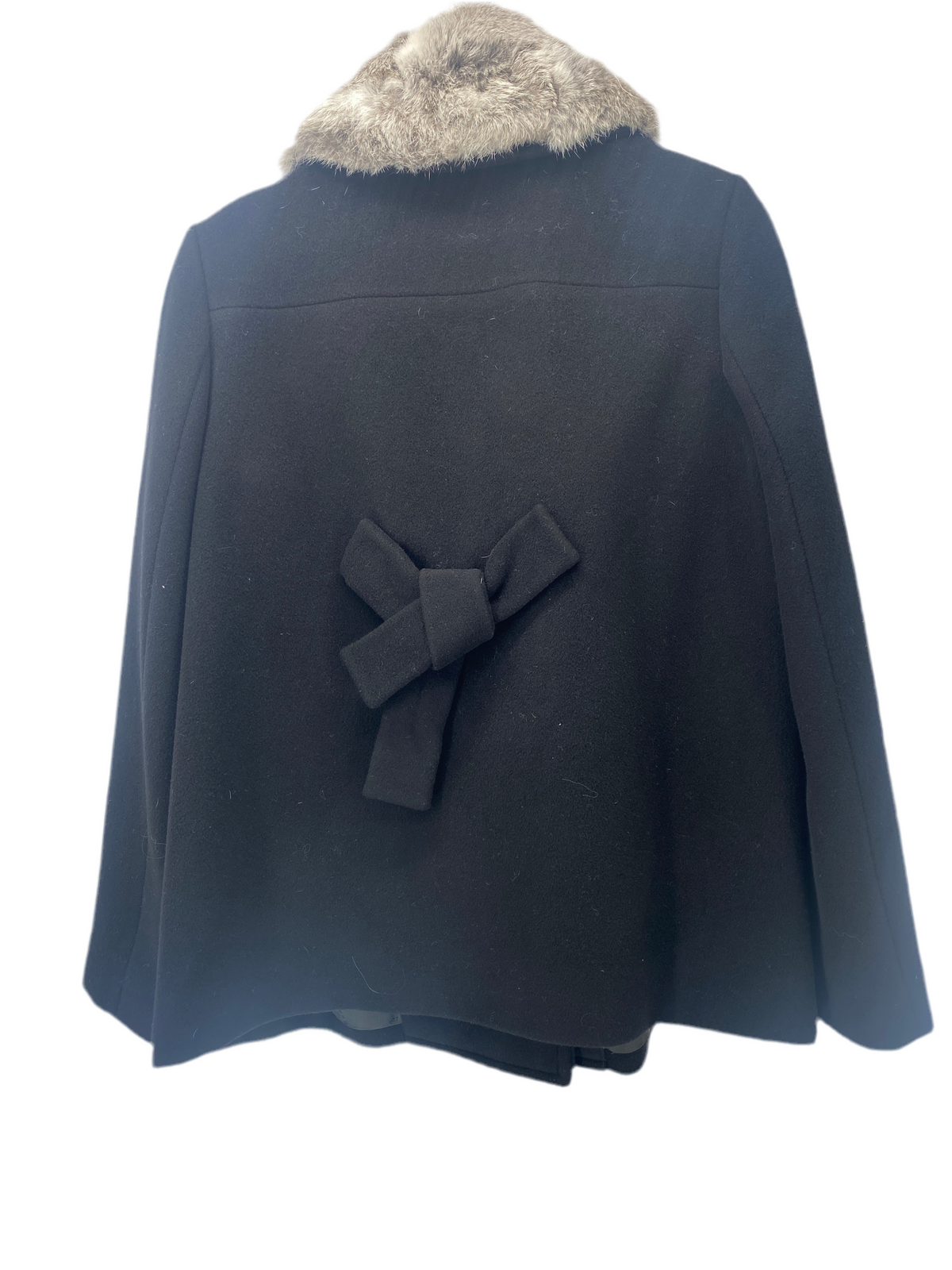 Manteau en laine noir avec le col en fourrure gris se ferme avec des pressions.
