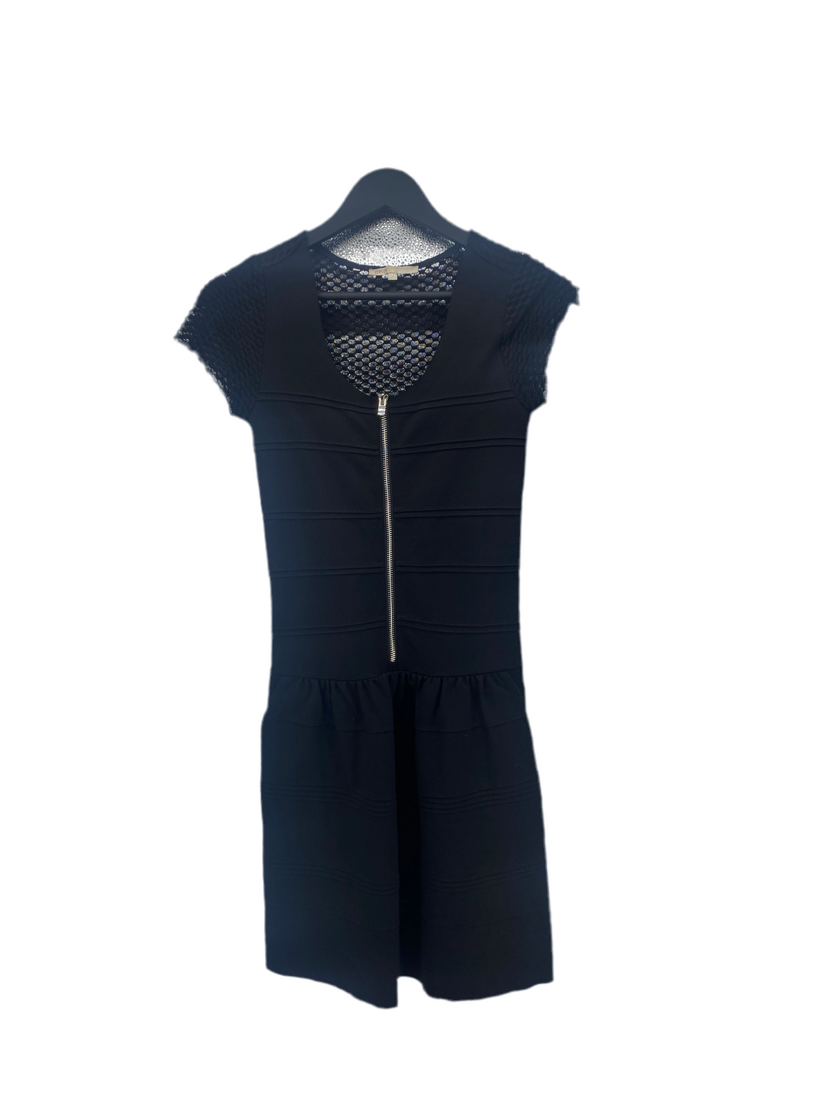 Robe courte noire, fermeture à l’avant dentelle au niveau des manches ainsi que sur le dos légèrement transparent