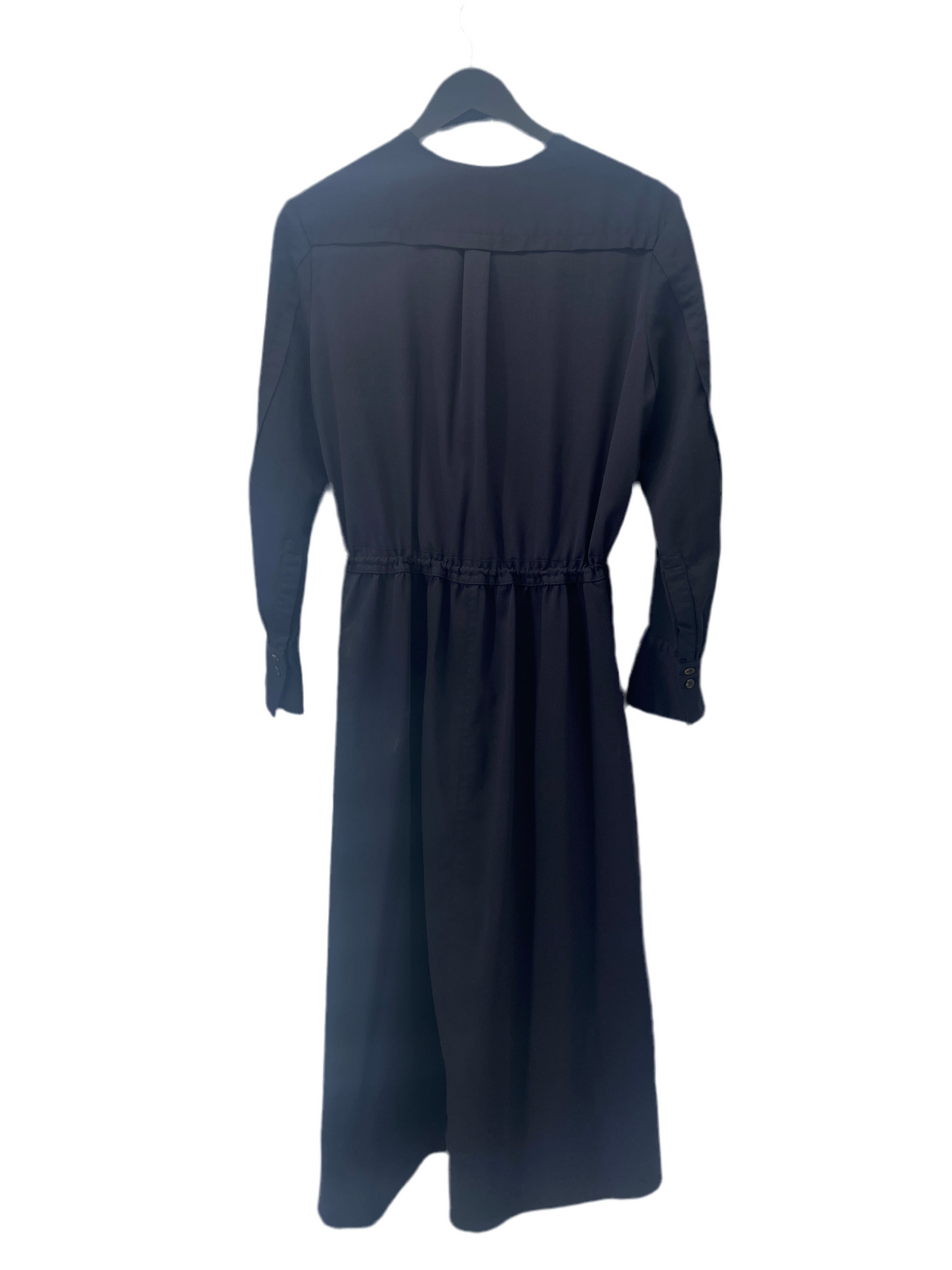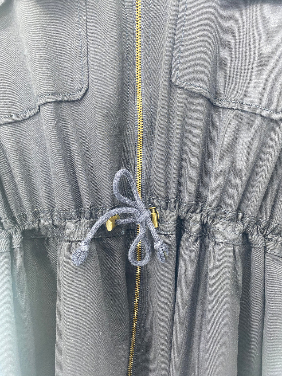 Robe en laine  longue bleu marine, zip tout au long de la robe à lavant peut se resserrer avec une petite ceinture à la taille.